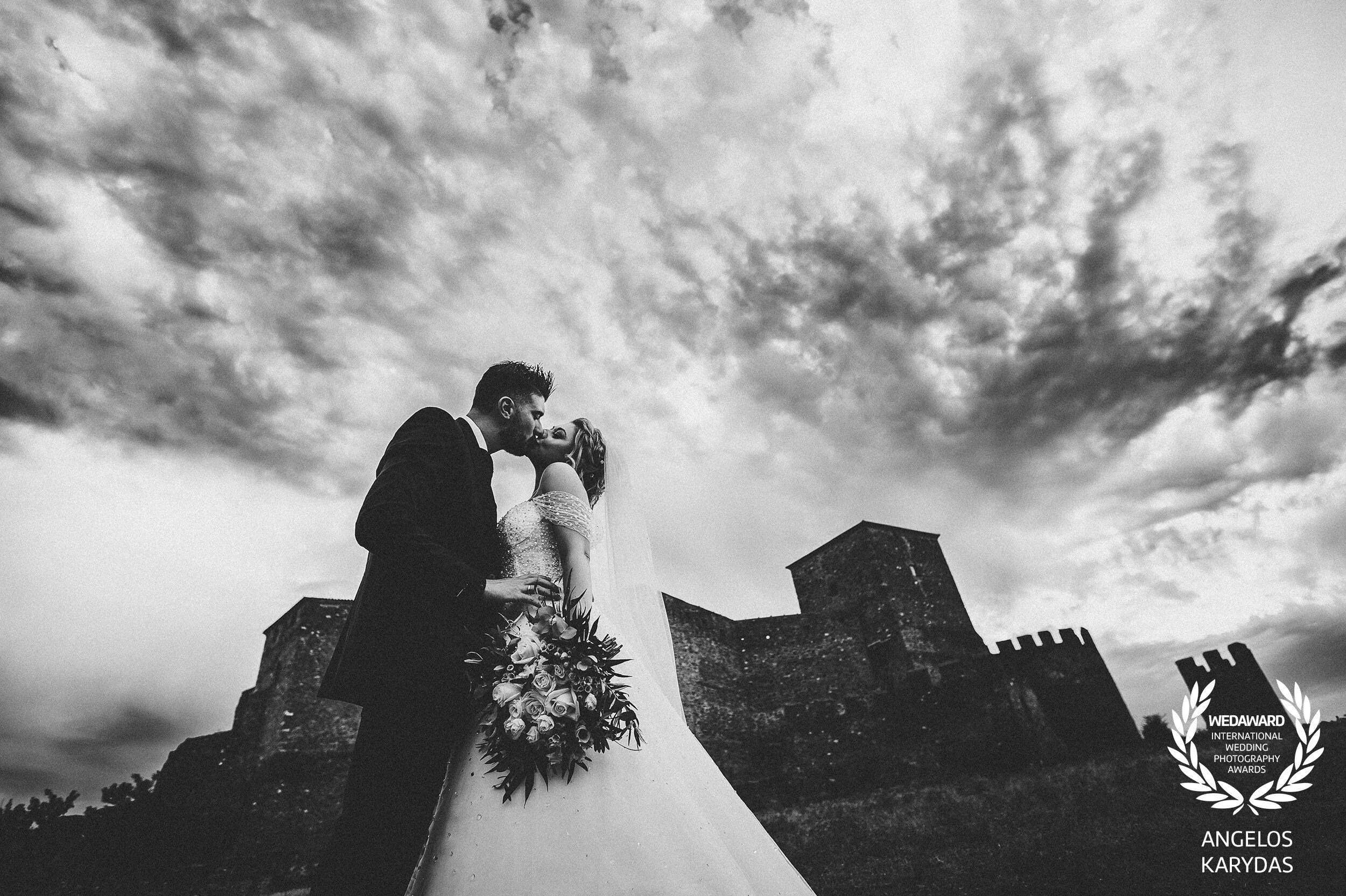 Beneath a brooding sky and ancient stone, they kissed as though writing their own legend. A love story etched in time, where romance meets the echoes of history.