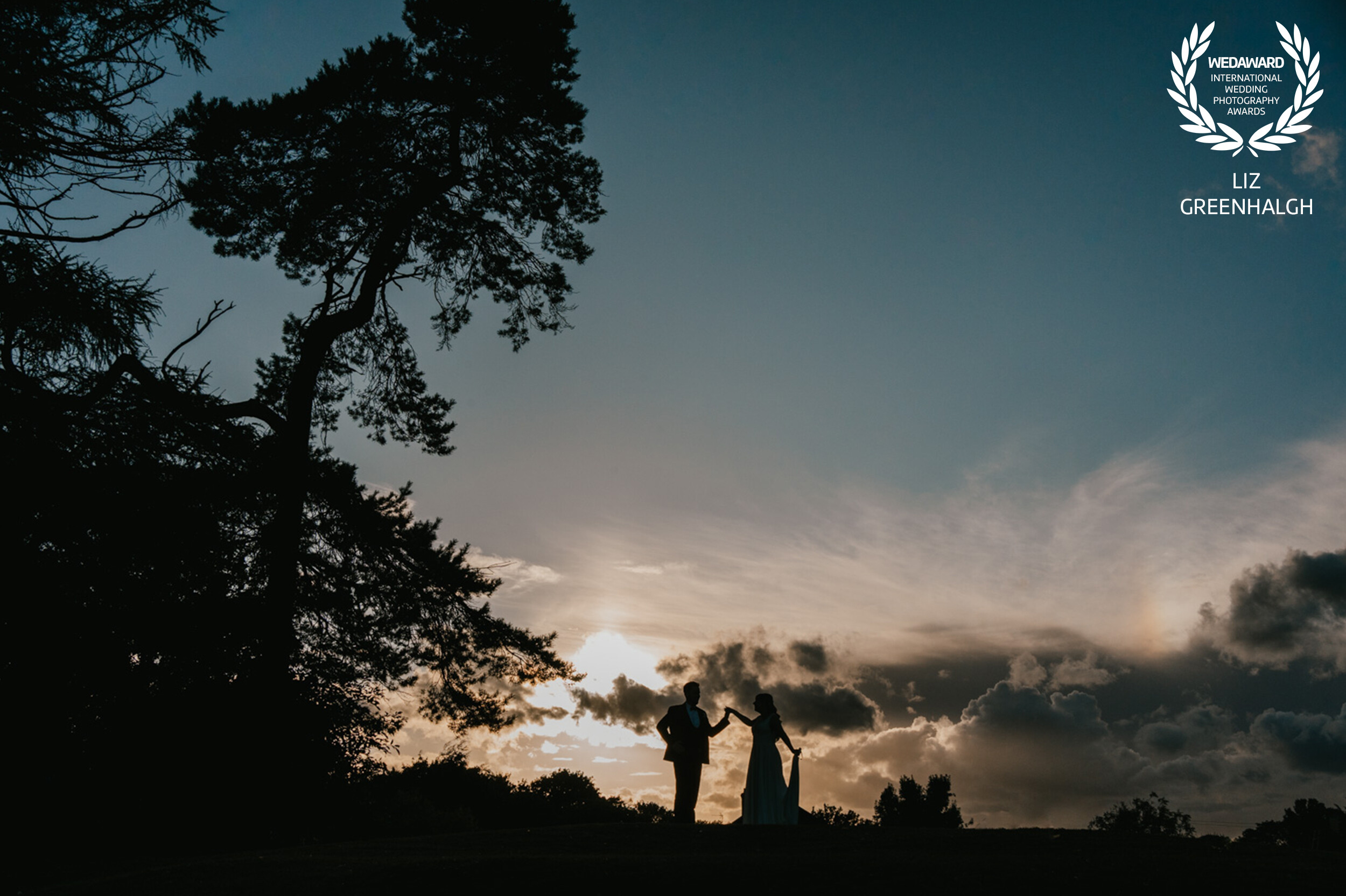 A romantic silhouette of Lydia and Rob at The Old Bridge Hotel, holding hands against a dramatic sunset sky framed by tall trees and rolling clouds.