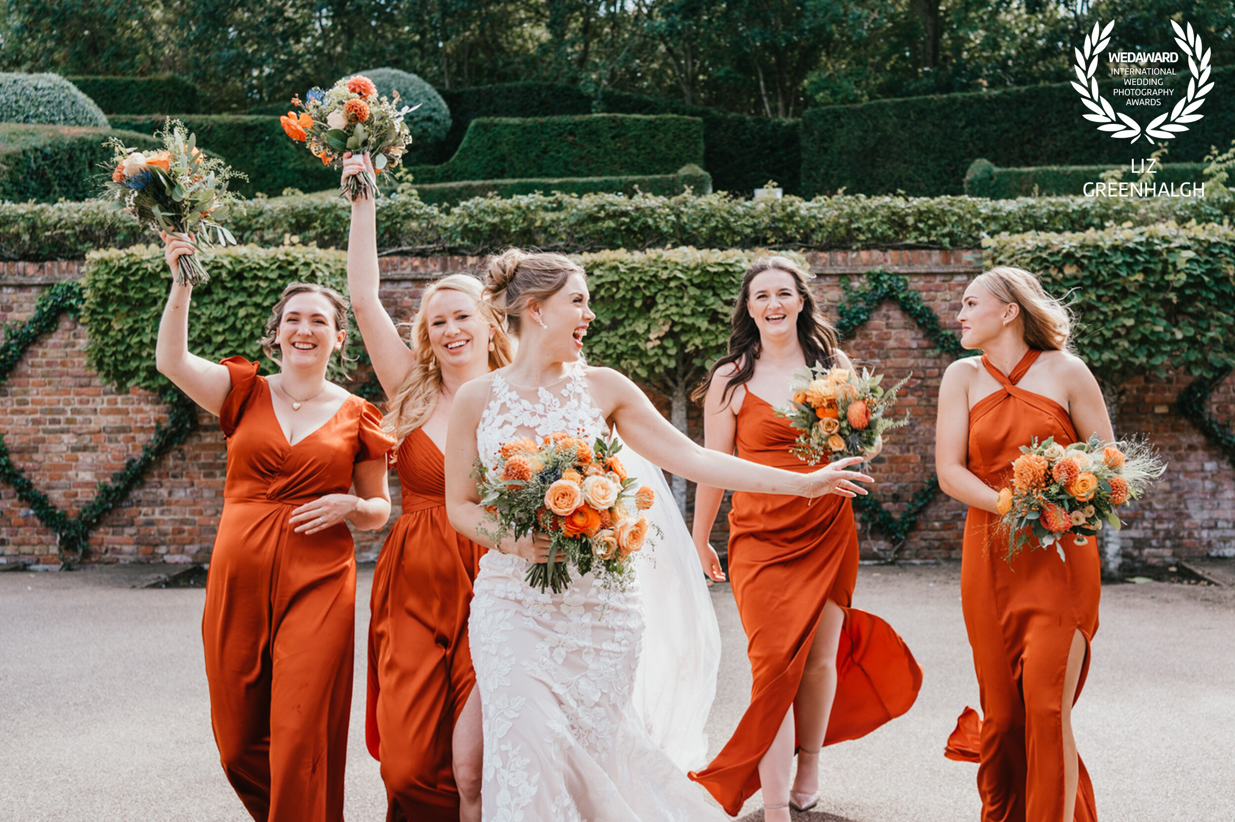 My joyful bride, Stef, and her bridesmaids in burnt orange dresses, laughing and celebrating together, holding vibrant bouquets of orange and peach flowers against a garden backdrop. ?The wedding was at The Old Hall Ely