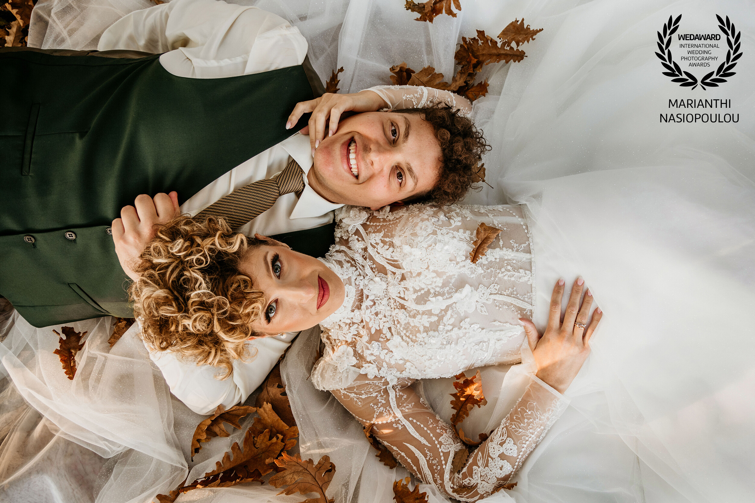 Wrapped in soft tulle and autumn leaves, Julia and Konstantinos lay side by side, sharing a quiet moment that felt as genuine as their smile. The gentle warmth of October, the textures of lace and nature, and the closeness between them turned this simple pause into a tender portrait of connection — a reminder that love often speaks loudest in stillness.