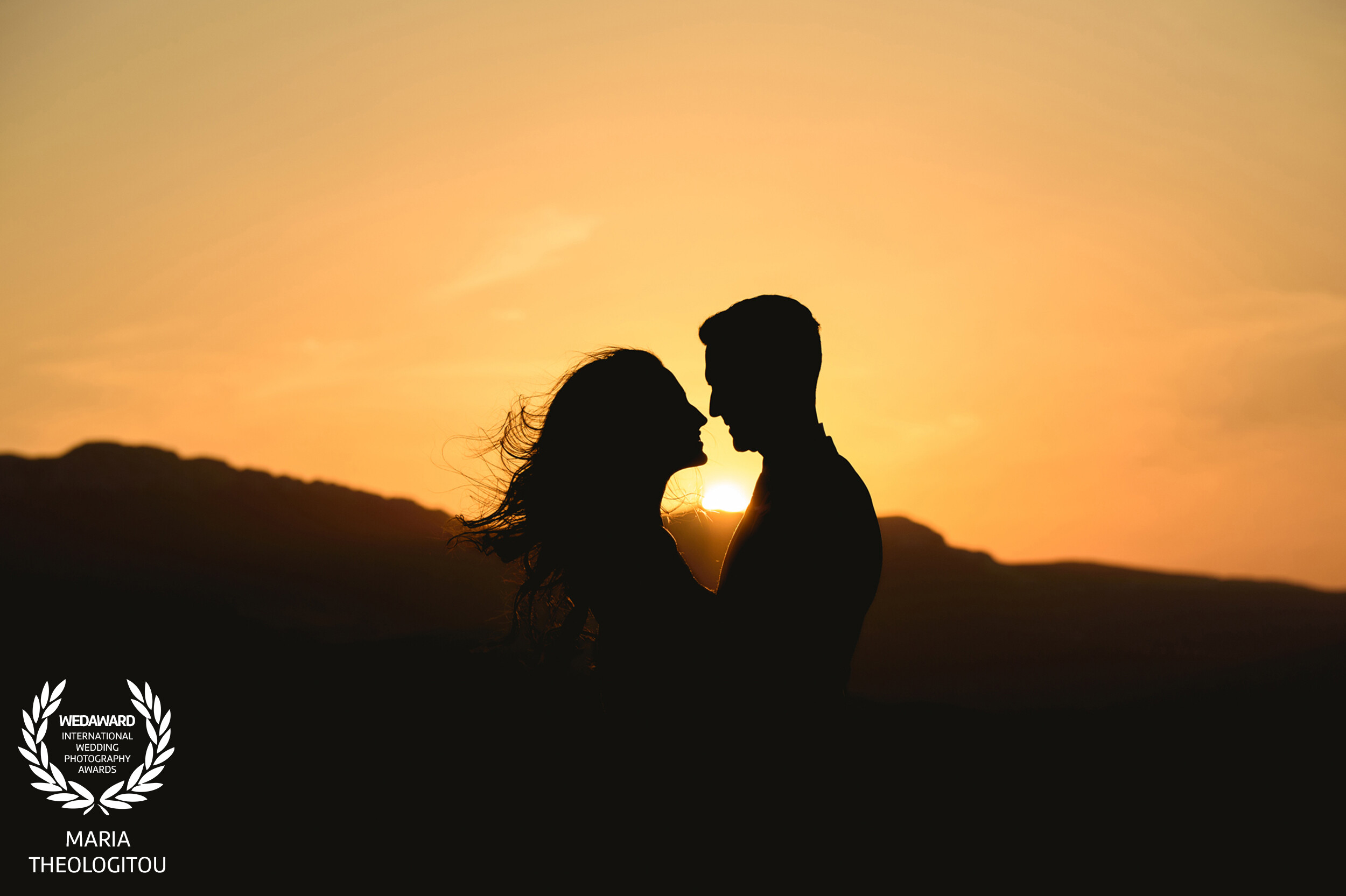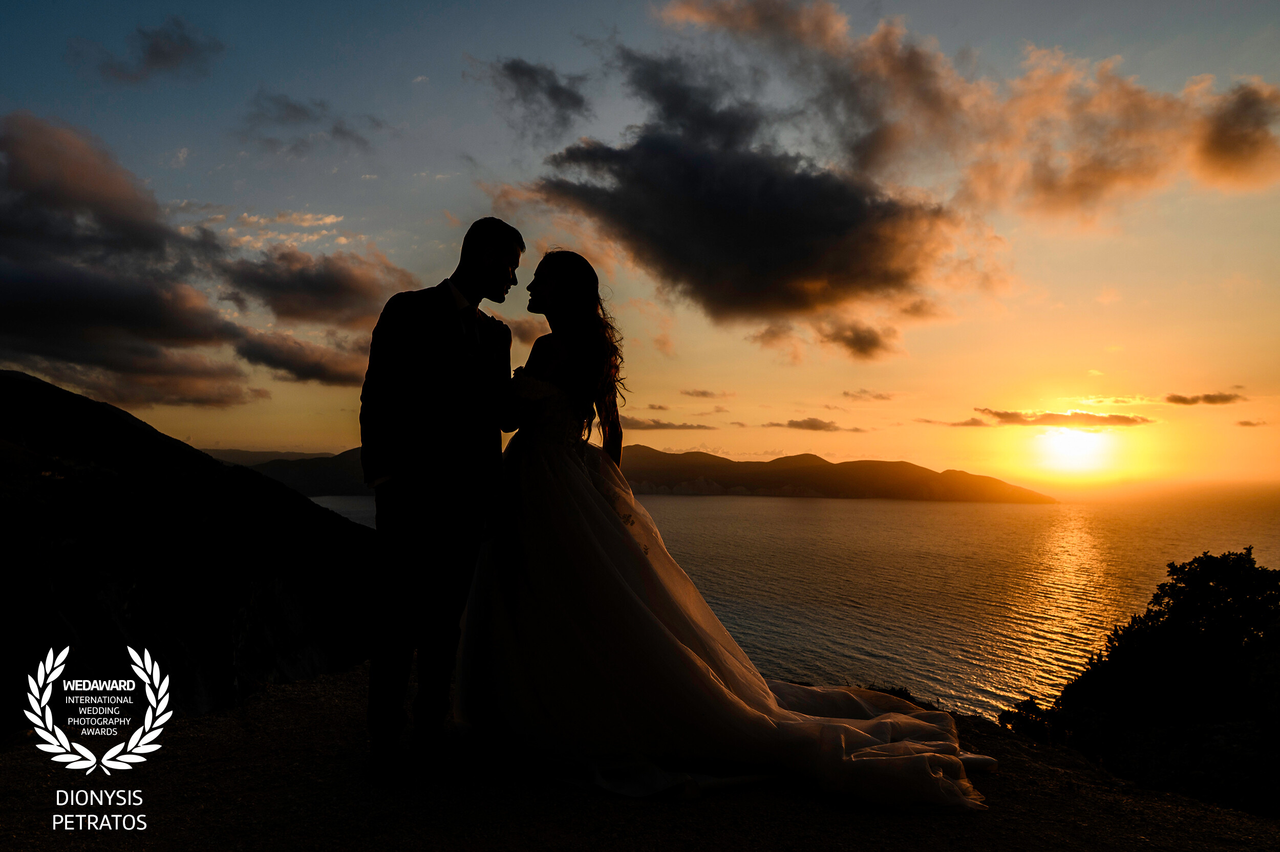 This photograph was taken on a cliff in Kefalonia Island Greece as the sun was setting over the Ionian Sea. The couple stood together for a brief moment, and the light shaped their silhouettes against the landscape. The scene was calm, natural, and beautifully understated — a small pause in time that turned into one of my favourite frames.