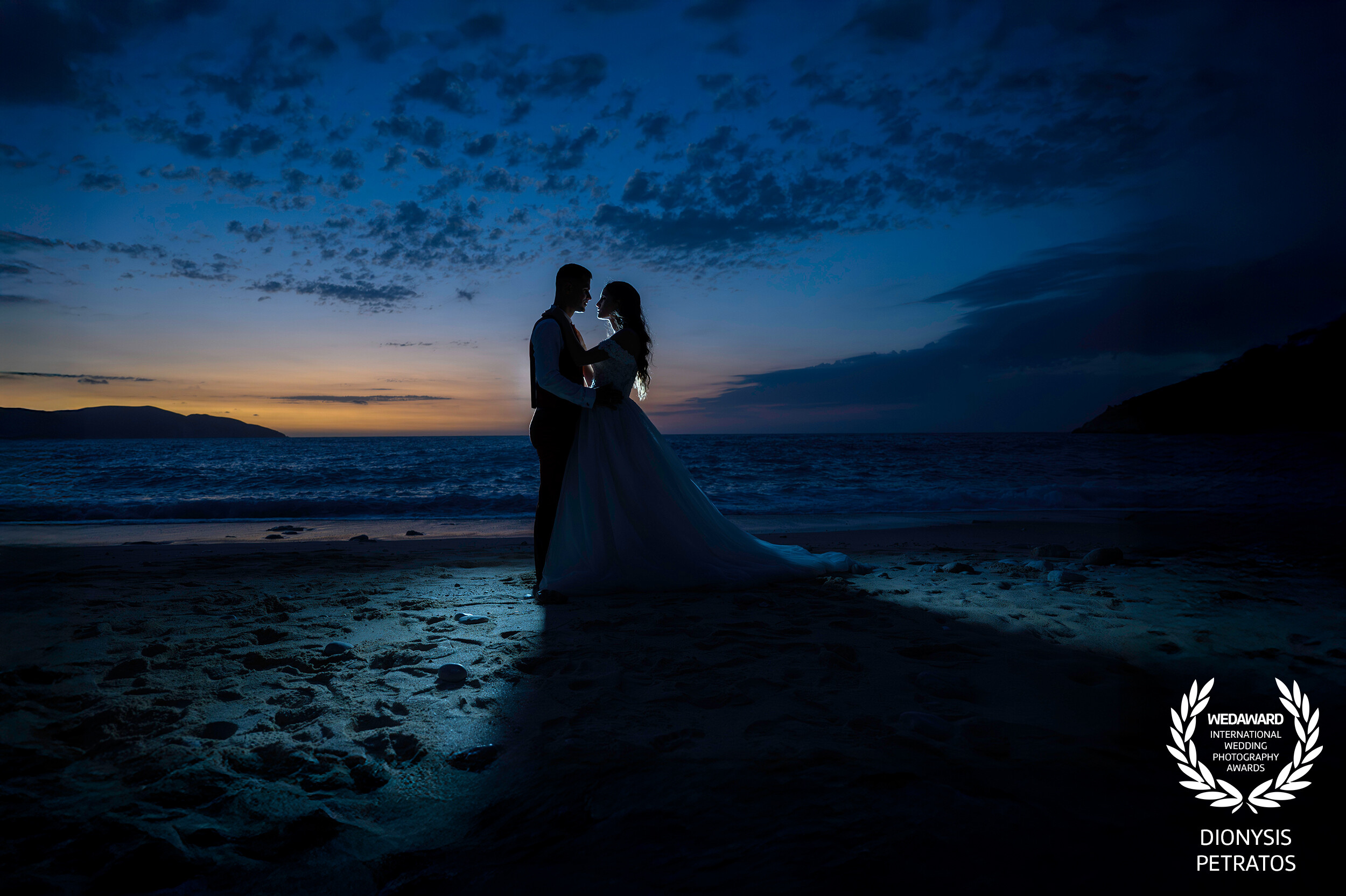 This image was captured on the beach during the last minutes of blue hour, when the day had almost turned into night. The couple took a quiet pause together, with the soft colours of the sky fading behind them. It was a simple, intimate moment. Just the two of them standing close as the shoreline darkened around them.