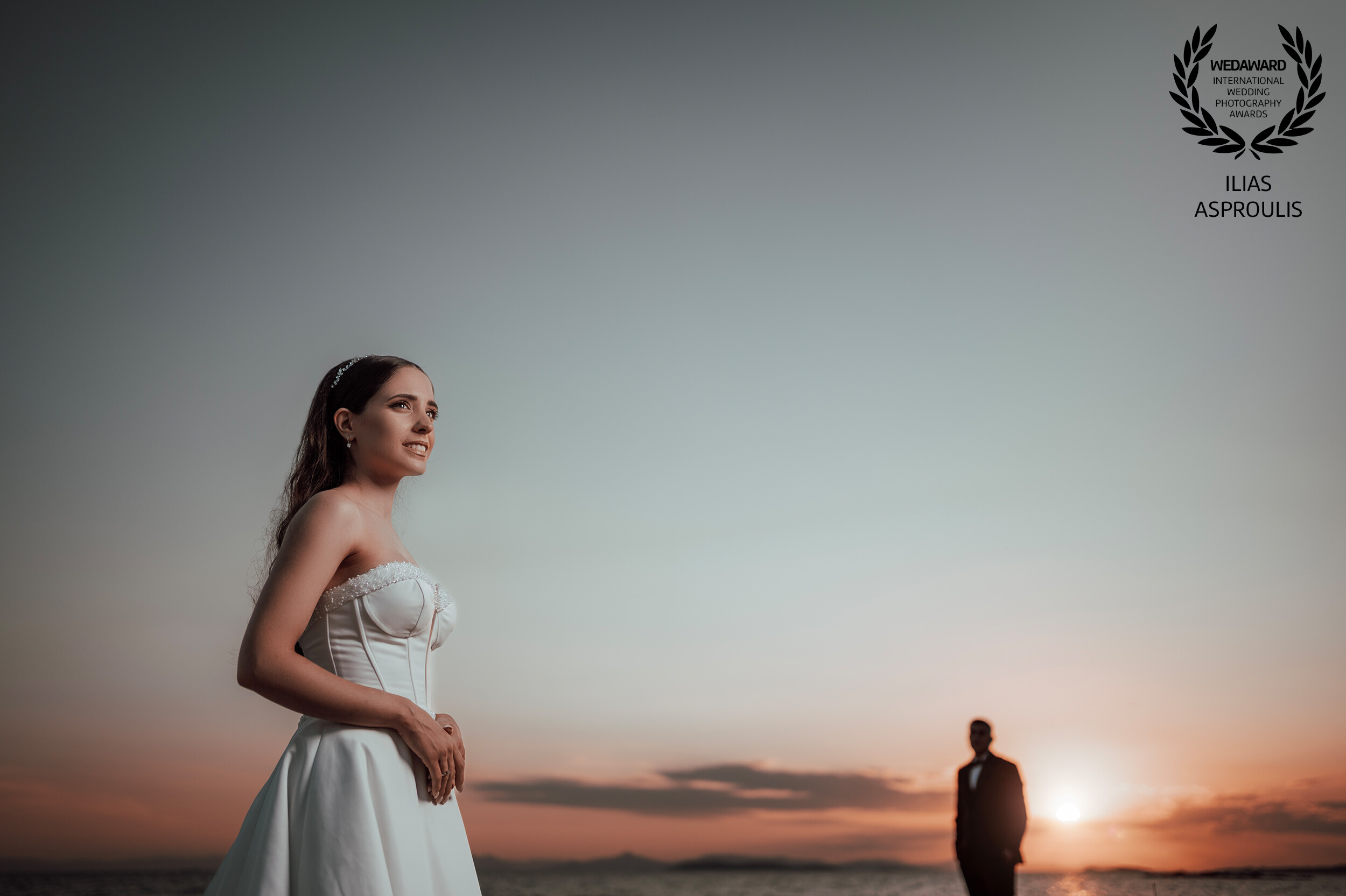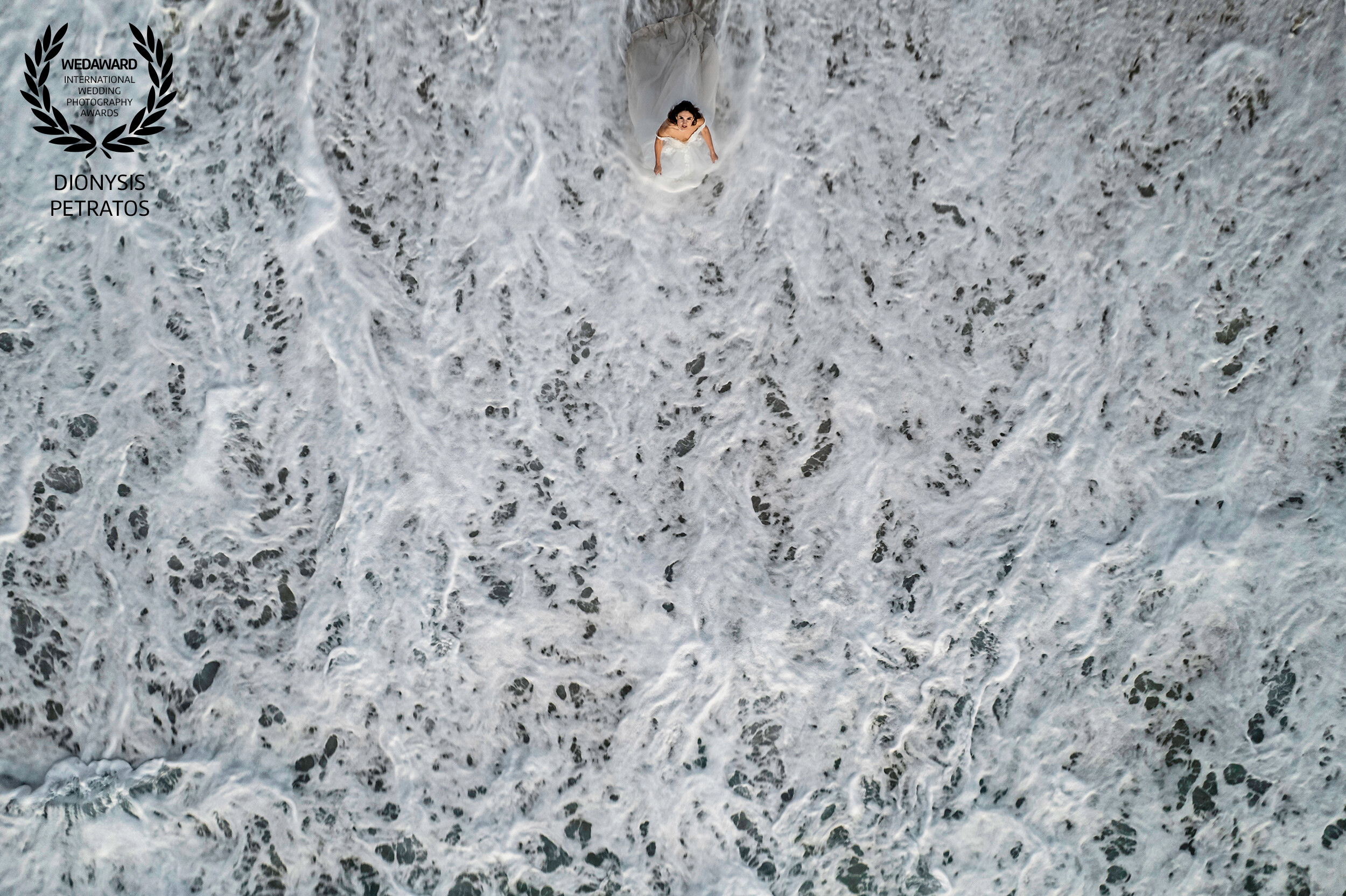This photograph was taken at Myrtos Beach Kefalonia, where the bride stepped into the water completely on her own, full of energy and excitement. Nothing was planned — she just moved straight into the waves. I placed her intentionally at the top of the frame, letting the movement and texture of the sea dominate the image. The result is a raw, lively moment shaped entirely by her energy and the power of the coastline.