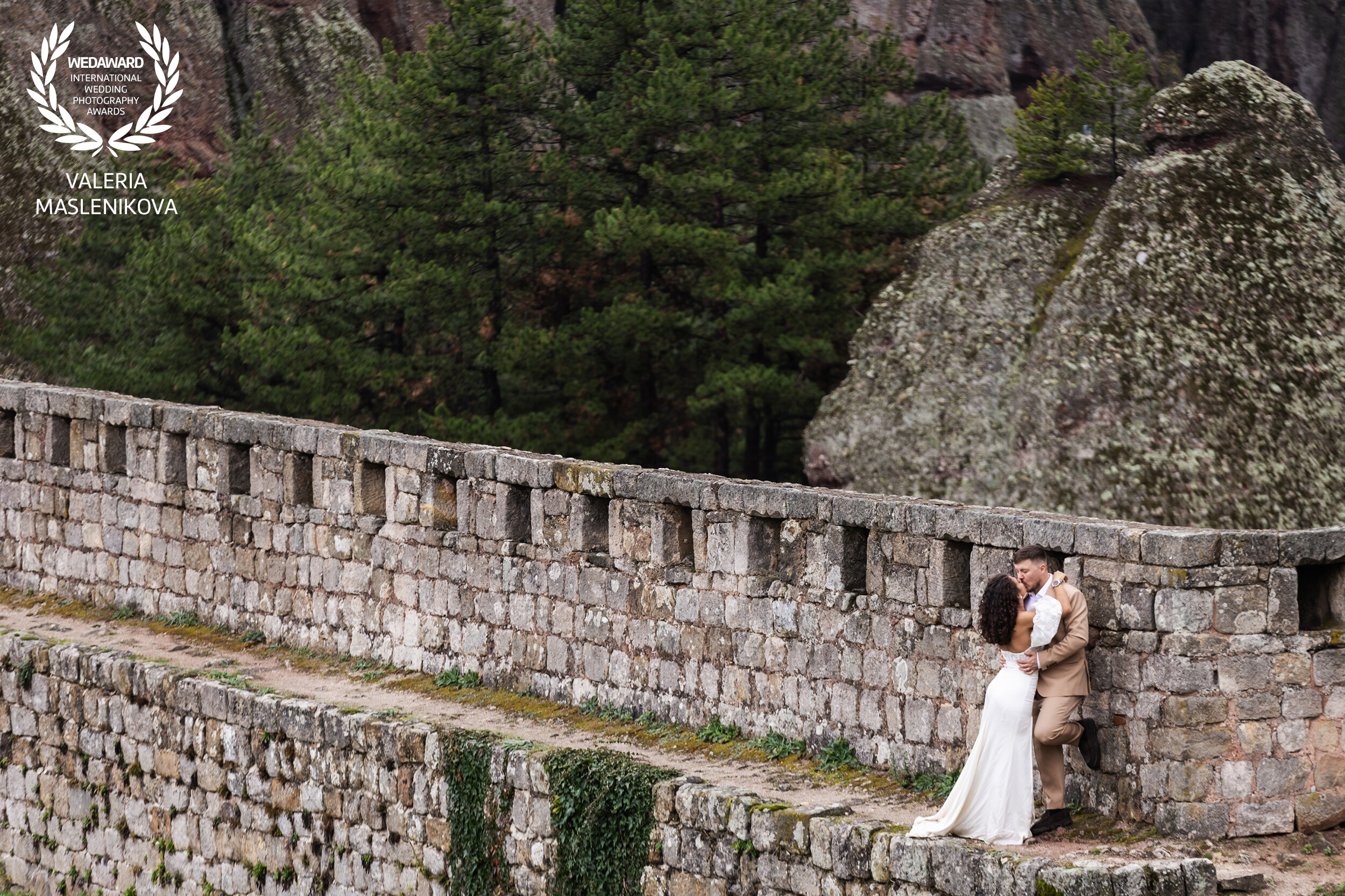 Rafaella and Sali share a quiet and heartfelt embrace on the ancient stone walls of Belogradchik, surrounded by majestic rocks and peaceful nature.