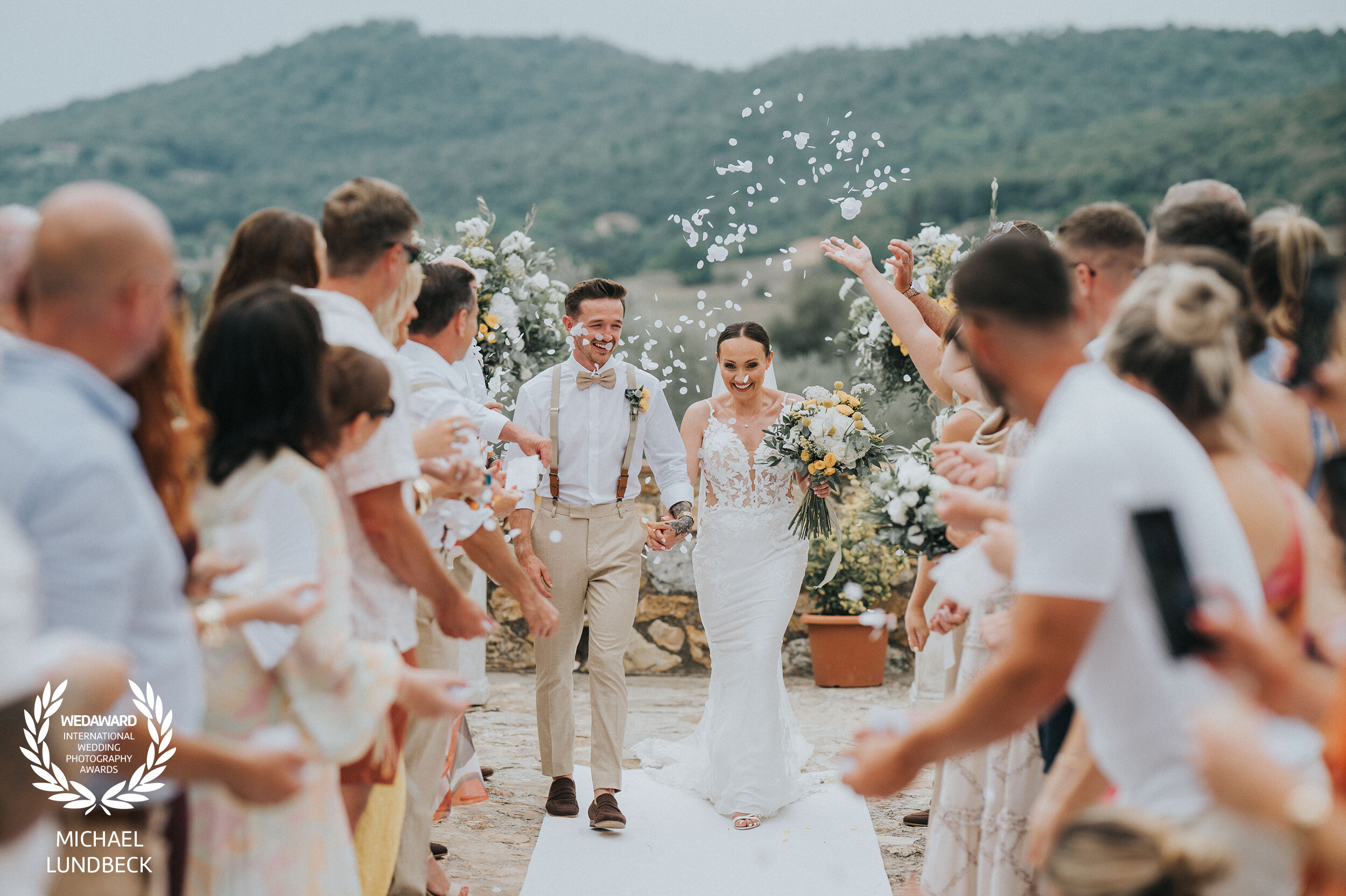 Themis & Zoe. A newlywed couple is lying together on a field of golden, sun-dried grass. Their bodies are gently intertwined, creating a sense of closeness and calm. The warm tones of the landscape surround them, giving the scene a dreamy, romantic atmosphere, as if time has slowed just for them.