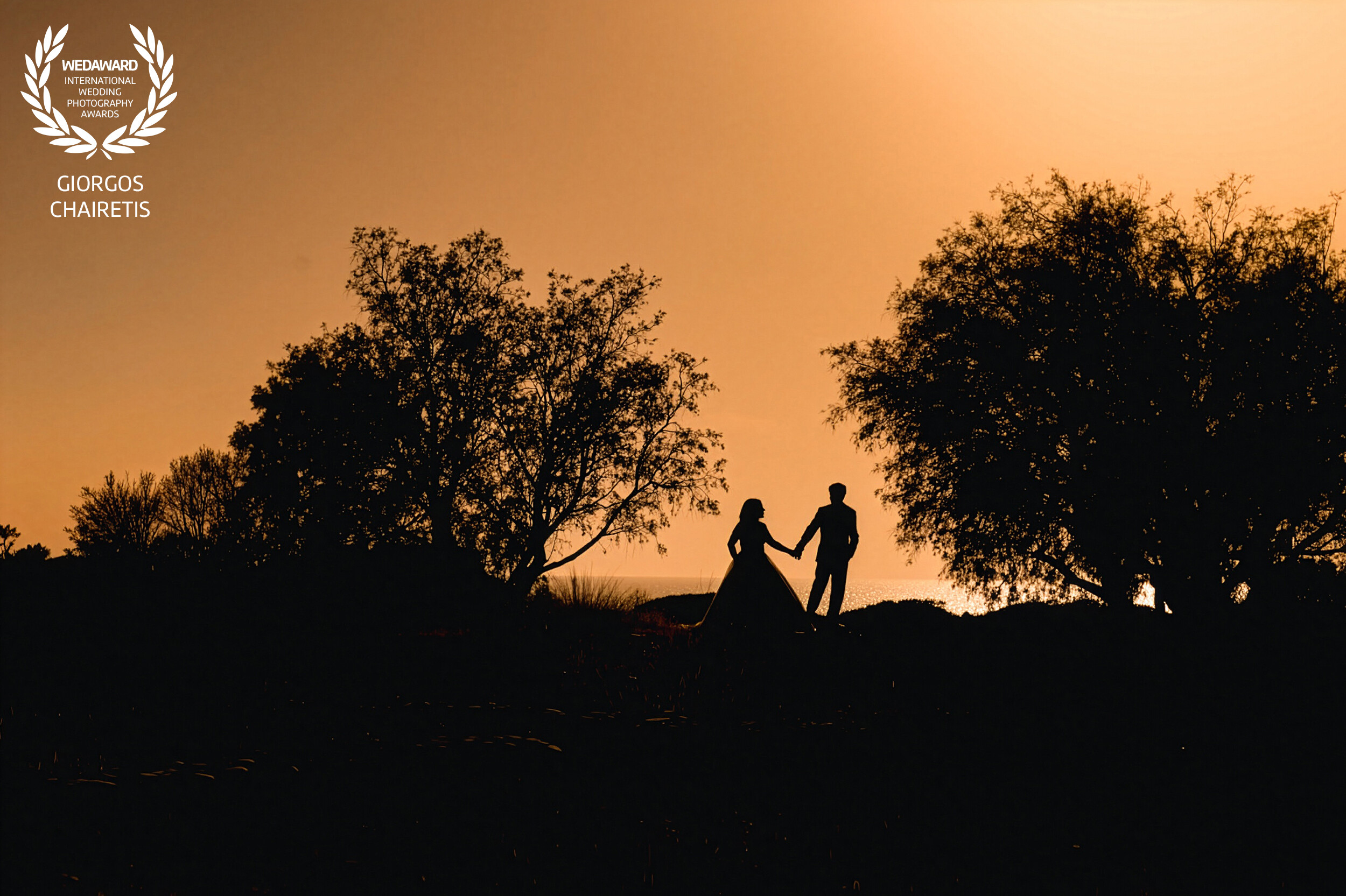 Antreas and Ioanna, hand in hand, silhouetted against golden light—like the final scene of a love story, quiet, cinematic, and forever.