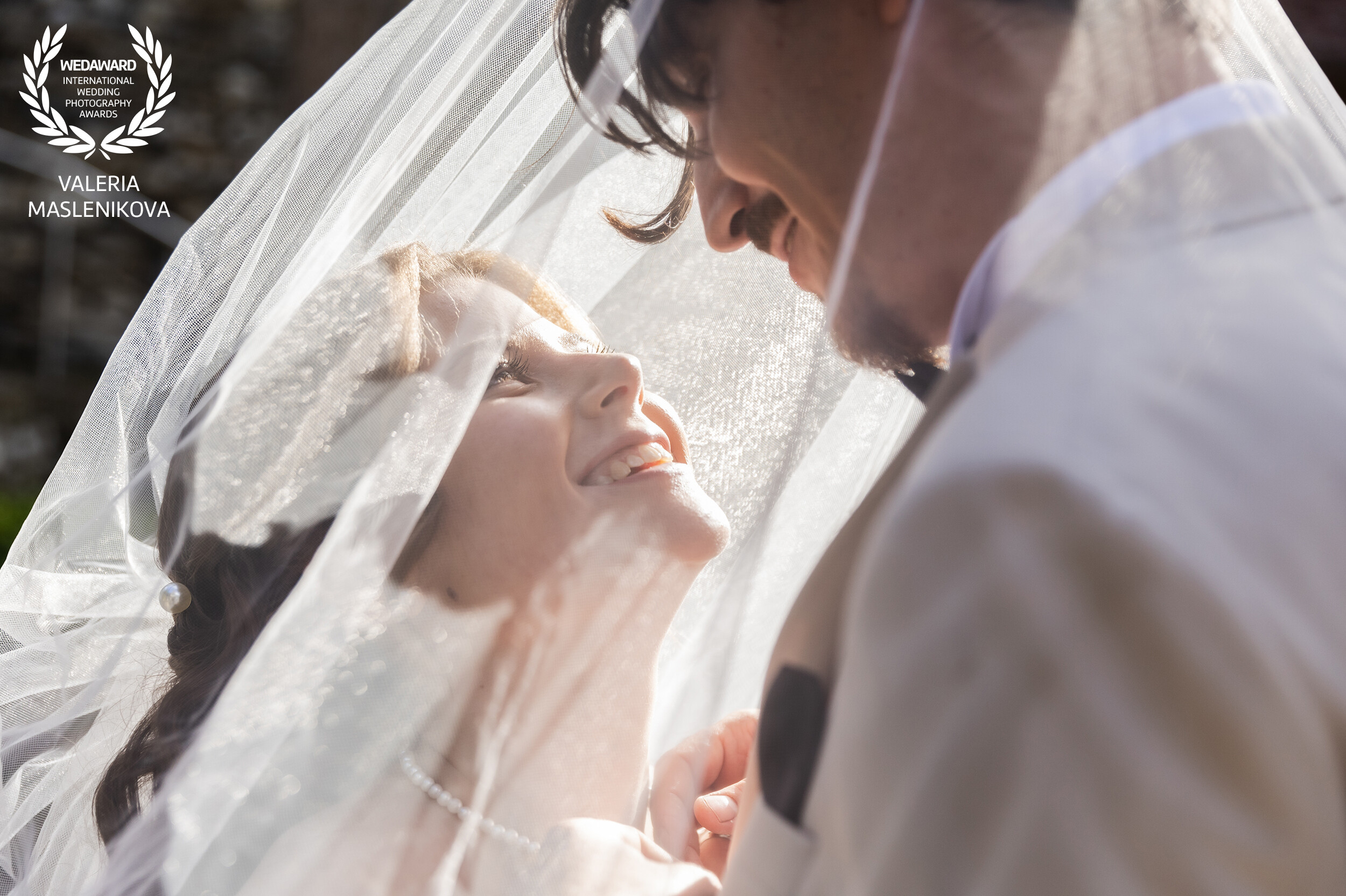 A breathtakingly intimate shot that beautifully captures the magic of a shared glance under the delicate folds of a wedding veil.