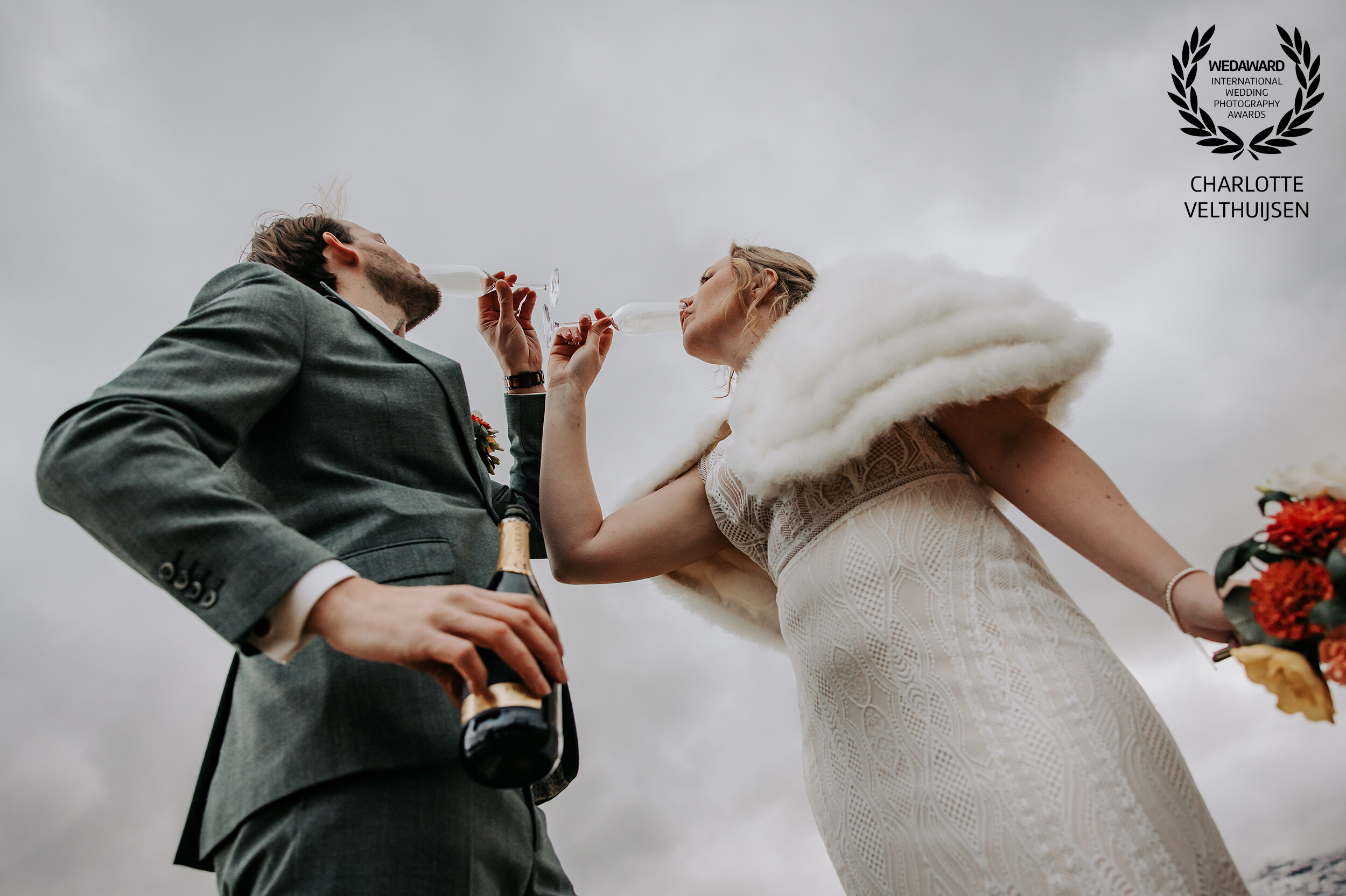 Beneath the moody Dolomite sky they toasted, laughter rising with the bubbles. A playful moment of joy captured between two newlyweds and the mountains. Location: Alpe di Siusi.
