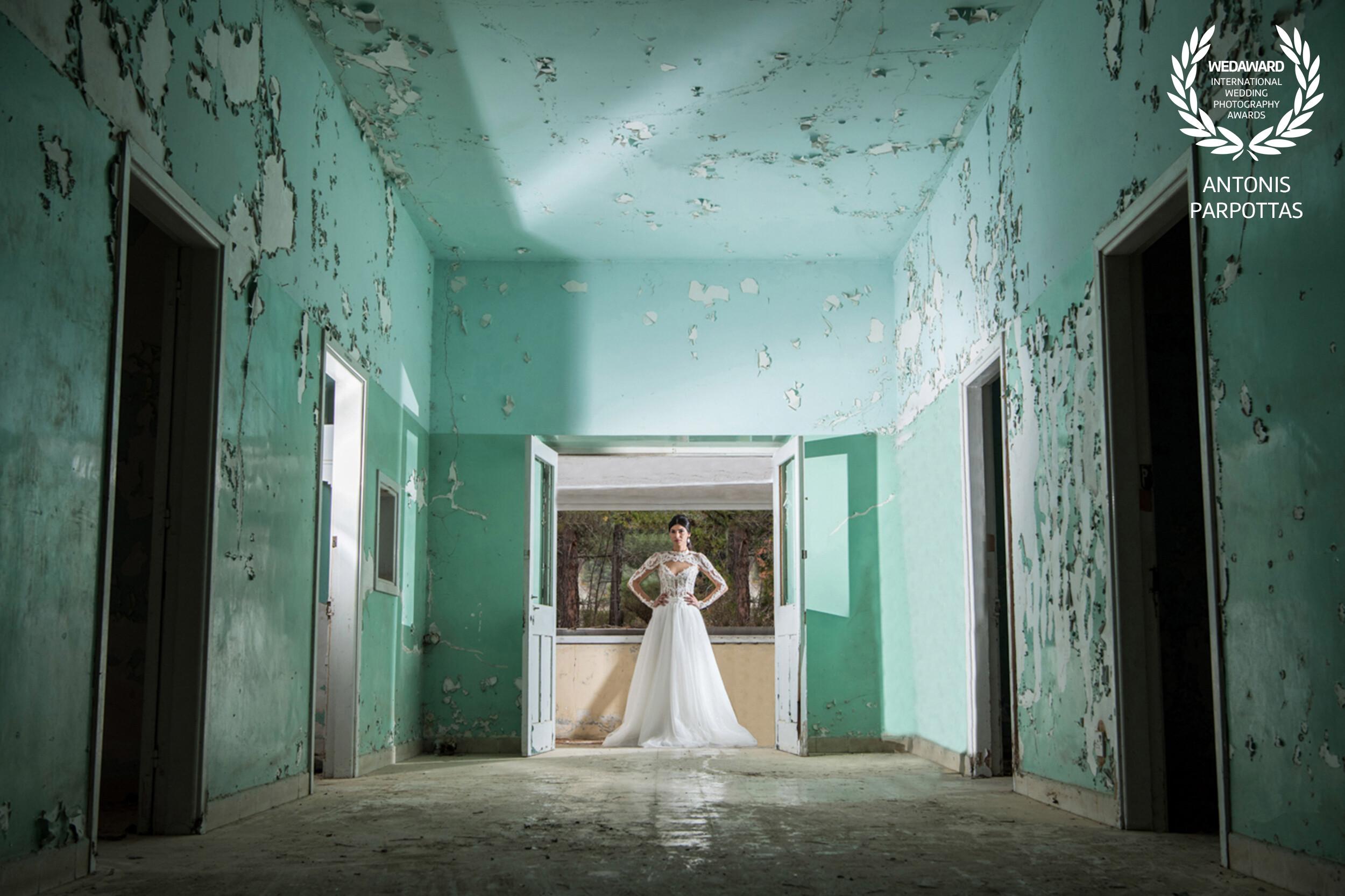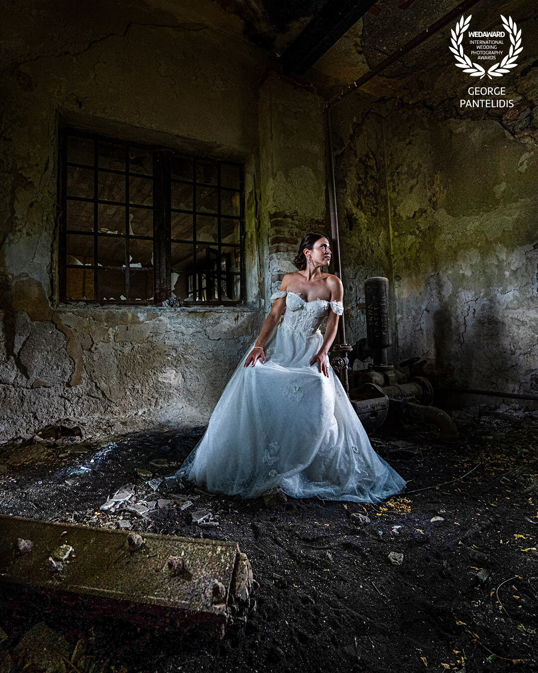 A bride stands between light and decay, in an abandoned place full of silence and memories. Her elegance meets deep emotion, creating a timeless and cinematic moment.