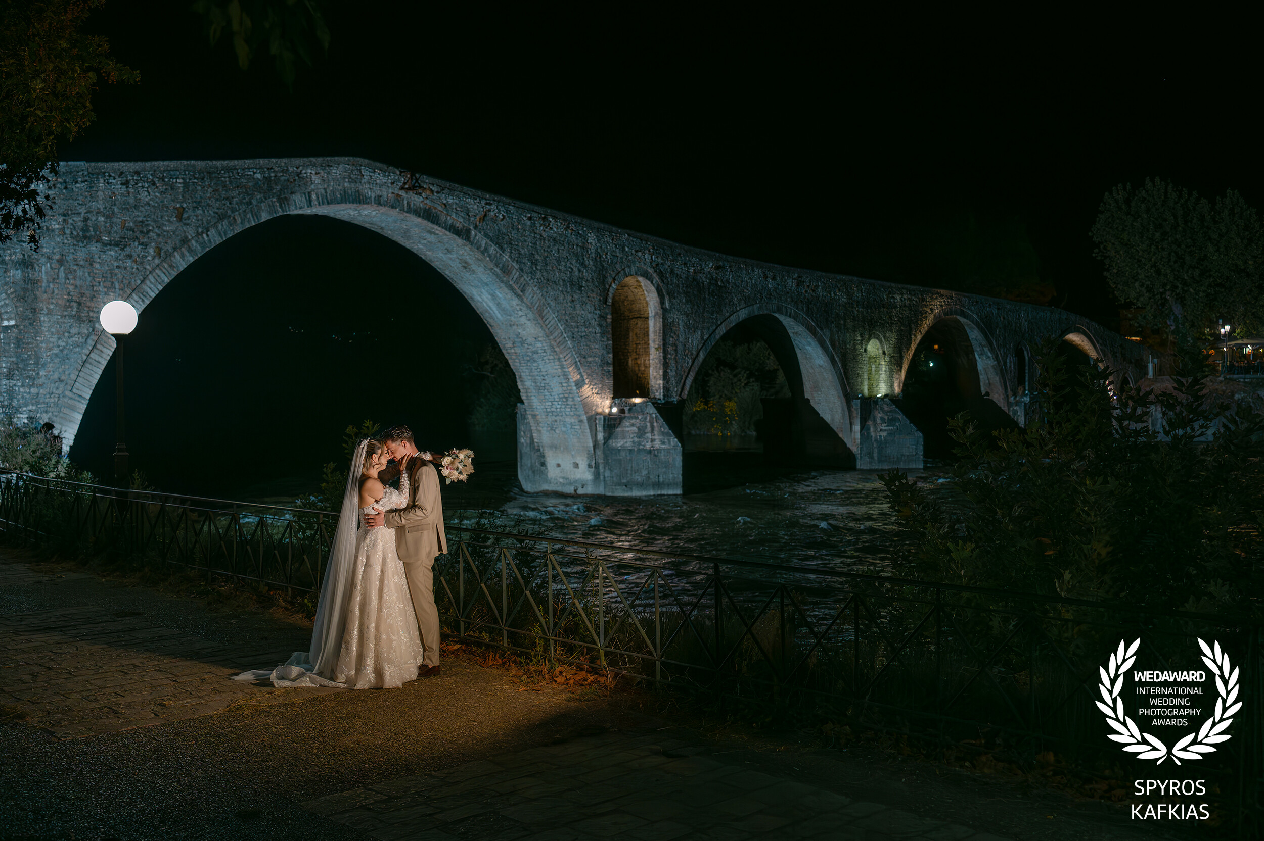 Under the illuminated arches of the historic Bridge of Arta, Spyros and Katerina share a quiet moment of connection. Standing before a monument steeped in Greek legend, the couple's embrace contrasts beautifully with the ancient stone, symbolizing a love built on a strong, everlasting foundation. A dramatic night portrait capturing the magic of Western Greece.