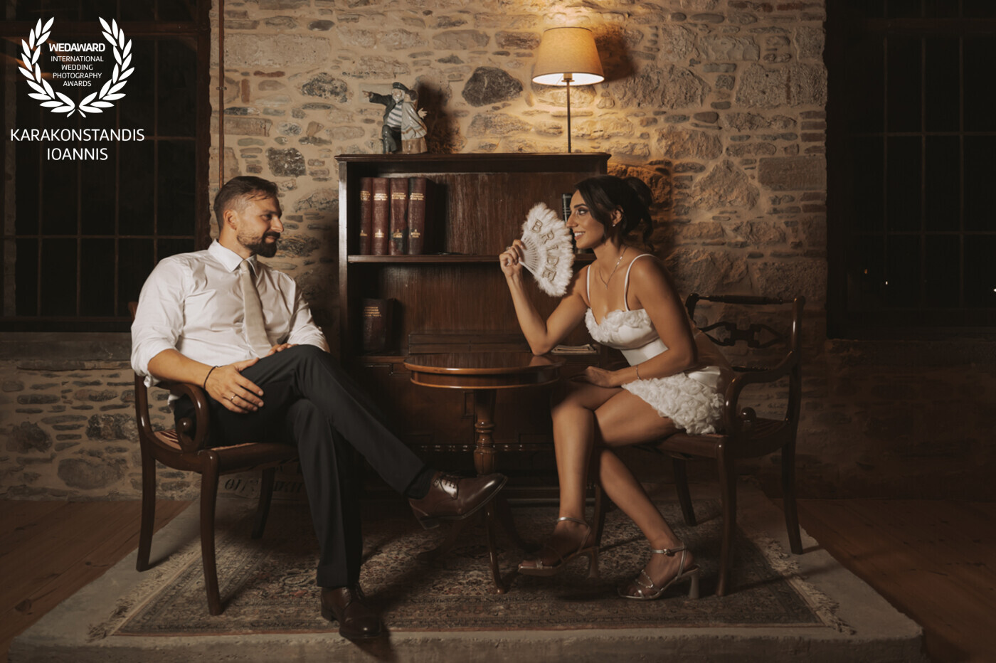 In one of the picturesque alleys of Manolates in Samos, Chrysanthi stands dressed as a bride with her eyes fixed on the future, while Elias approaches, stepping on the cobblestones with a decisive step. The black and white aesthetic enhances the timeless beauty of the moment, capturing the union of two worlds in a village where time seems to have stopped. A shot full of emotion, anticipation and deep love!!!