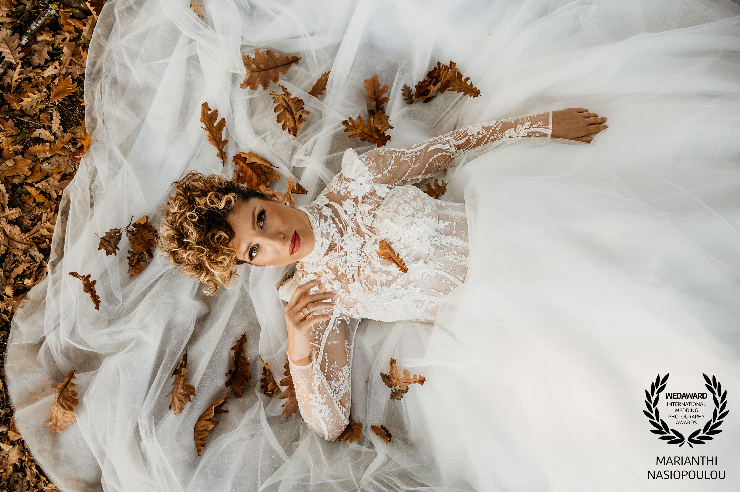 Wrapped in soft tulle and autumn leaves, Julia and Konstantinos lay side by side, sharing a quiet moment that felt as genuine as their smile. The gentle warmth of October, the textures of lace and nature, and the closeness between them turned this simple pause into a tender portrait of connection — a reminder that love often speaks loudest in stillness.
