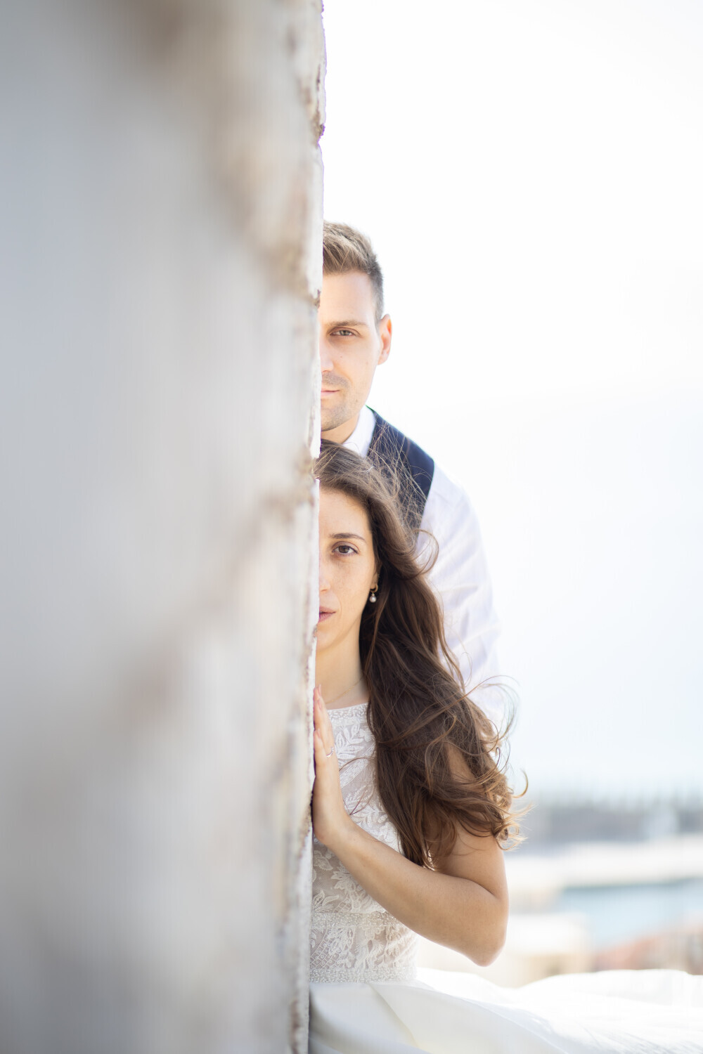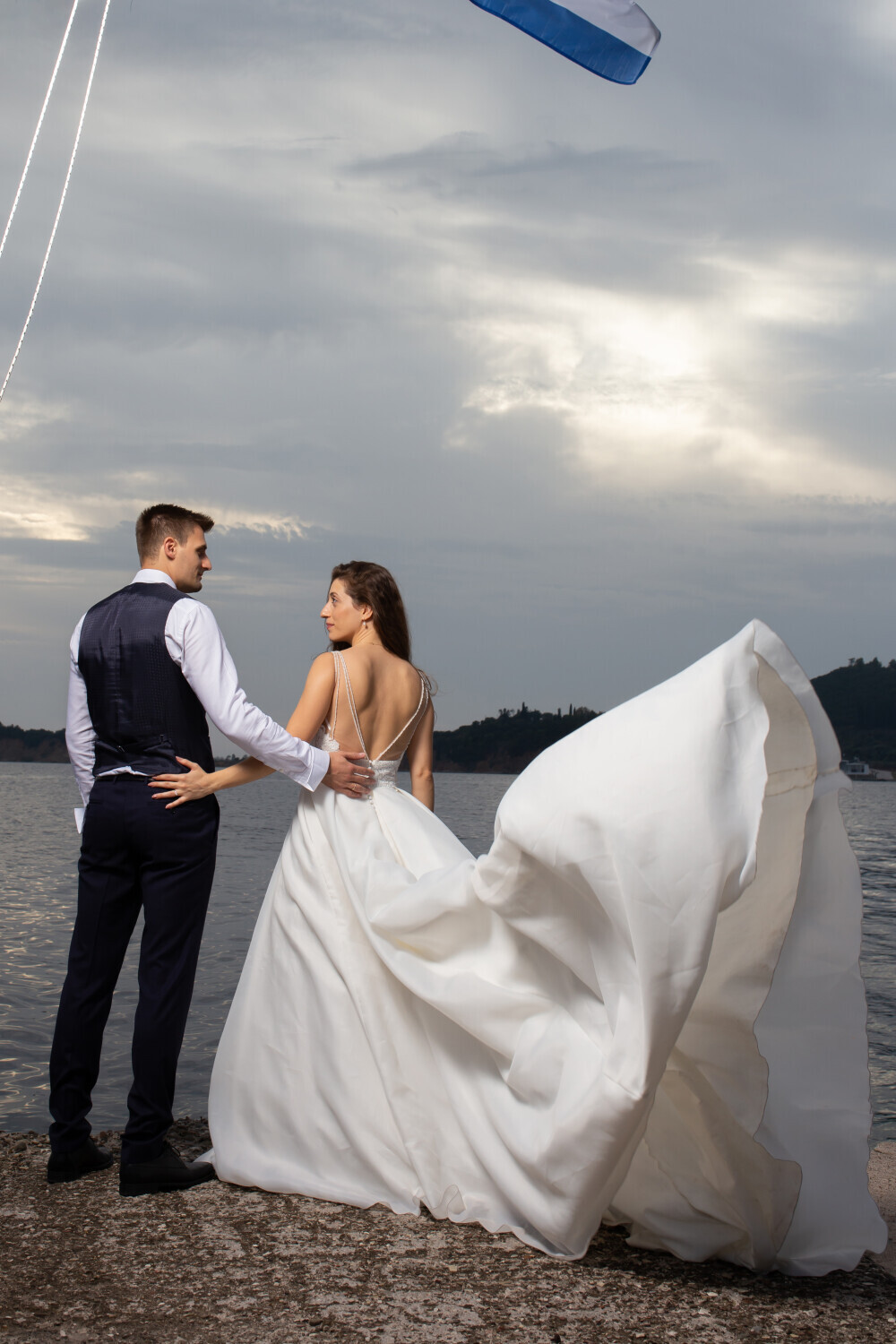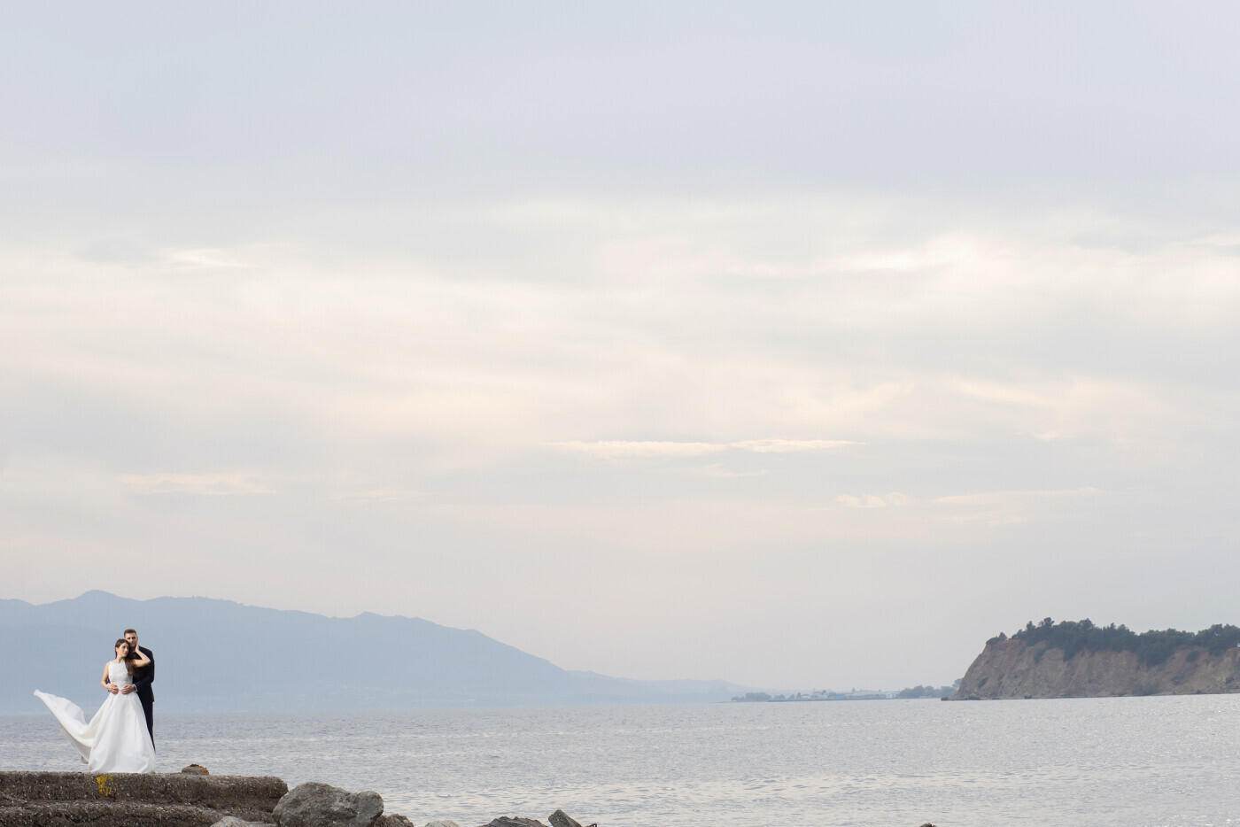 A romantic wedding photo of a beautiful married couple standing by the sea, surrounded by a soft breeze and golden sunset light.